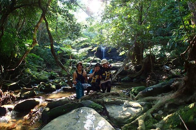 西表島の美しい沢をマングローブカヌーの後、さぶざぶトレッキング。苔むす岩、緑色の空気に包まれた森。光る白い水。最高に涼しいコース。