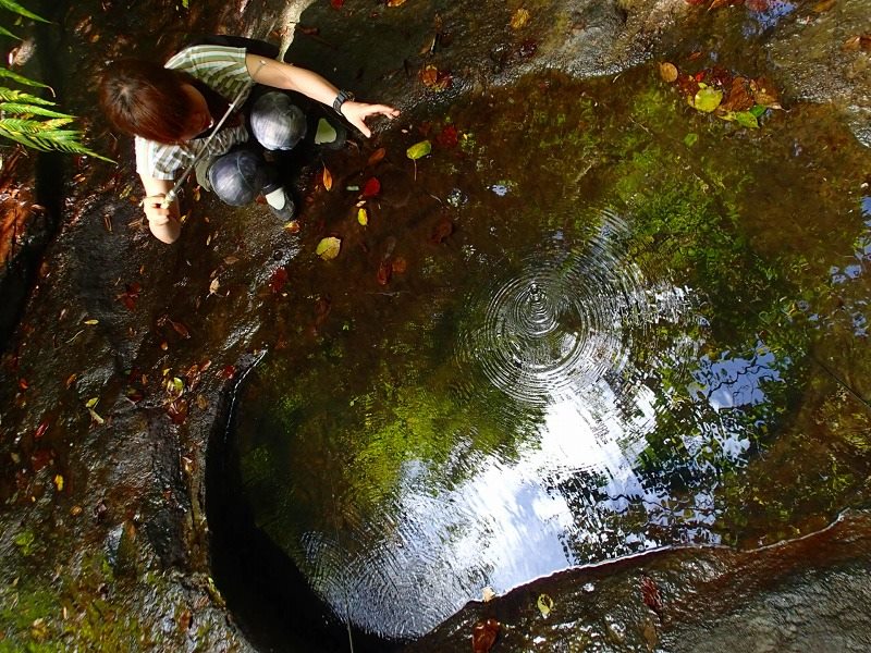 西表島の美しい沢をマングローブカヌーの後、さぶざぶトレッキング。苔むす岩、緑色の空気に包まれた森。光る白い水。最高に涼しいコース。